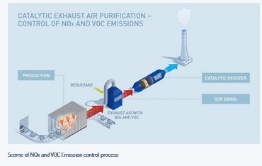 The process of reducing the nitrogen monoxide (NO) and nitrogen dioxide (NO2) takes place in the catalyst. The function of the catalyst is to lower the reaction temperature, which would otherwise be between 900 and 1000°C, to the required operating temperature of 300 to 350°C.