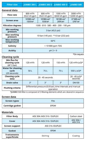 ROTOR JUMBO are self-cleaning screen filters designed for filtration of liquids containing solid particles even colloidal. Special suction pads ensure the complete cleaning of the screen with minimum water consumption and without stopping the filtration process. All filters are supplied ready to work, with valves, pressure gauges and electronic controller included. The JUMBO series includes models of JUMBO ROTOR specifically designed to treat large volumes of water(from 800 to 3000 m3/h), with a filtration degree ranging from 1500 to 100 μm, though maintaining all the key features of the smaller models of the family.