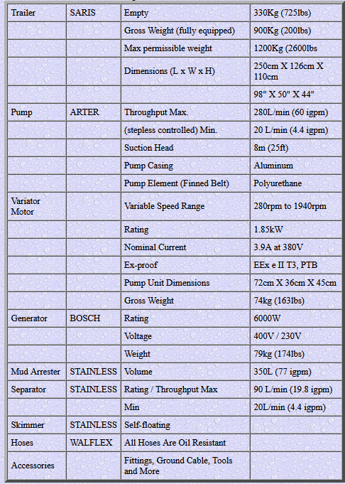The unit is equipped with a specially designed pump to eliminate emulsion dunng processing, driven by a variable speed, explosion proof Electro-motor, powered by a portable generator set Auxiliary equipment consists of a float skimmer, hoses, leveling jacks and tools required for an independent operation. This Swiss made unit built in stainless steel and aluminum is explosion proof and complies with international fire codes.