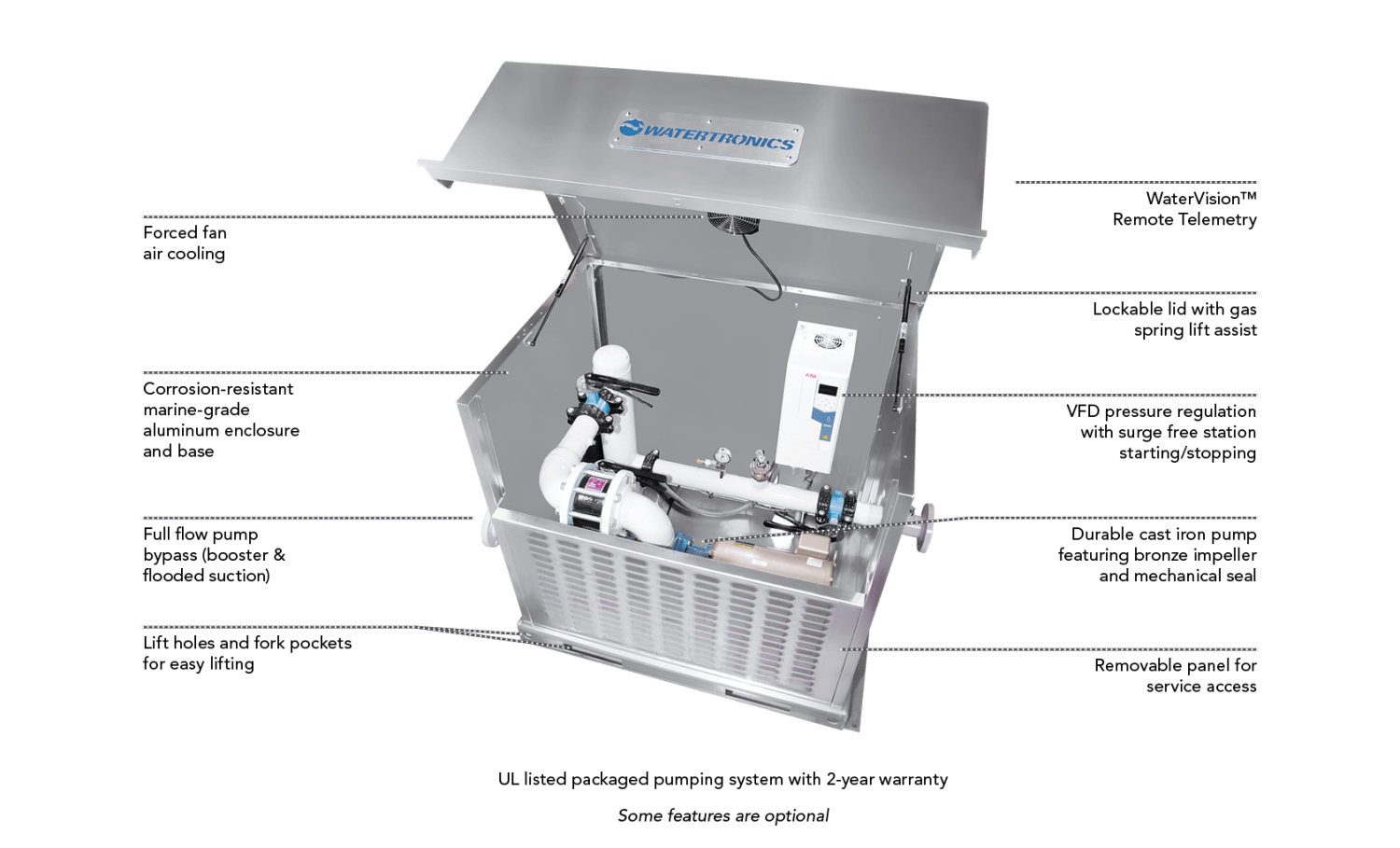 - Marine grade aluminum enclosure with lockable lid, forced fan air cooling, and gas spring assisted lid lift