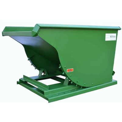 Size: 3/4 cu yd, Capacity: 2,000 lbs. 12 gauge thick steel body with continous weld for superior strength. Formed top with reinforced front body angle for optimum strength. Z-bar base with exclusive extruded trunnion track & taper pins for wear resistance. Ductile iron lift up release handle with secure flip latch. Roura safety green paint.