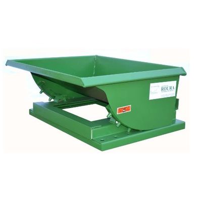 Size: 1/8 cu yd, Capacity: 2,000 lbs. 12 gauge thick steel body with continous weld for superior strength. Formed top with reinforced front body angle for optimum strength. Z-bar base with exclusive extruded trunnion track & taper pins for wear resistance. Ductile iron lift up release handle with secure flip latch. Roura safety green paint.