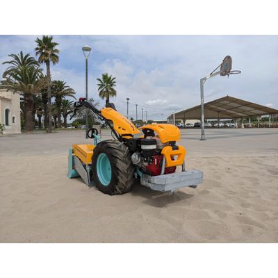 These machines are equipped with a sieving-vibrating grid that filters the sand and separates it from the dirt. The sand is returned to the beach and all the remains of the dirt are deposited in the rear hopper, the hopper is emptied manually. The hopper is emptied manually.rnThe working depth can be adjusted from the control position of the beach cleaner by means of a practical rotating device.rnThe advance of the Troyer is controlled from the control station located at the rear by the person guiding the machine. On this station there are three levers, a speed button and the brake and clutch controls. The levers are for operating the vibrating grate, for setting the forward or reverse position of the machine and for setting the forward and reverse gears. The multitude of uses of the Troyer makes it suitable for cleaning hotel beaches, beach volleyball and beach soccer areas. The Troyer can also be used off the beach in sandy playgrounds and on golf courses to clean and aerate golf bunkers.Easy to Use and Maintain:Designed to be intuitive, our machine does not require extensive training to operate. In addition, it is easy to maintain, ensuring long life and consistent performance.