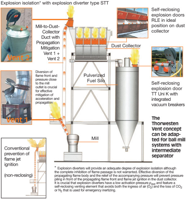 Since most of the plant is located outside, venting is not a major problem but you need to vent a lot of kinetic energy from the mills to filter to silos and prevent the reintroduction of flesh air after the explosion event to minimise subsequent fires or secondary explosions.