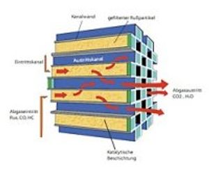 The DPFN++ system consists of ceramic monolith, sheathed with a stainless steel can and internal insulated with an elastic mat against vibrations. The filtration is achieved by a wall-flow method where the channels are plugged on one end and particles are remaining in the wall while the gas flows through the walls. A huge number of channels result in a big filter surface with a high storage capacity for soot particle.