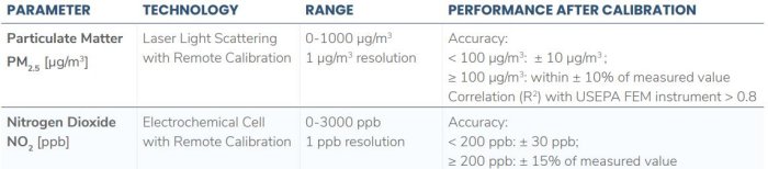 The Clarity Node-S measures PM2.5 and NO2. Additionally, PM1 and PM10 measurements are available dependent on the project.
