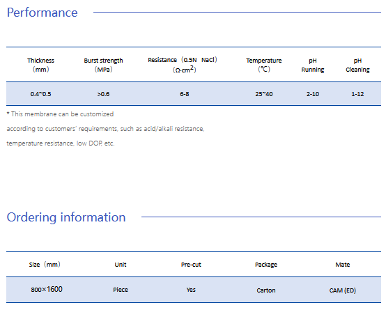 - Lower resistance: compared with traditional heterogeneous membrane, its resistance is reduced by 30%-50%, which reduce the energy consumption.