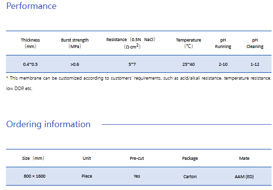 - Lower resistance: compared with traditional heterogeneous membrane, its resistance is reduced by 30%-50%, which reduce the energy consumption.