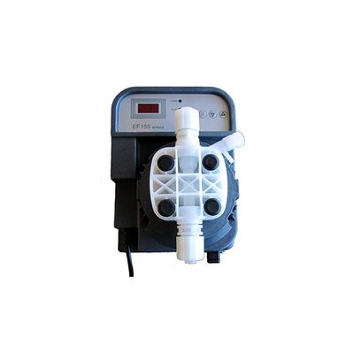 Electromagnetic pumps for wall installation. Three-digit LED display. Input for level sensor. Optional input for external consent. Working frequency adjustable (0-140 injections/min) through keyboard and display visualization. Basic ON/OFF dosing pump (EF155), version with timers for pause-work schedule (EF156), pump with pulse input (EF157), model with built-in pH/RX meter and electrode input on BNC (EF158). Available with 3 flow rate curves. PVDF or PP pump head, Pyrex ball valves and FPM (or EPDM) seals. Dosing head with self-bleeding option. Power supply: 230 V~. Prewired power cable (upon request, with Schuko plug). Supplied complete with standard kit of accessories (foot filter; injection valve; pipes for suction, delivery and bleed lines). Available housing colours: grey (standard), green or blue.