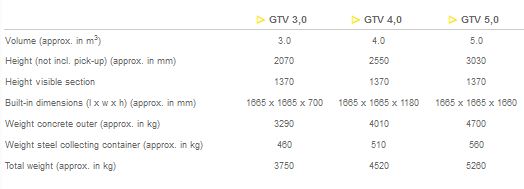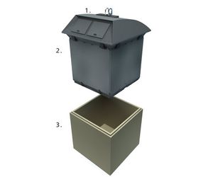 The Model GTV is a similar construction to the Model GTU and works in exactly the same way. A galvanized collection container is placed in a concrete outer - part of which is below ground level. The main difference is the shape: it`s square - a refreshingly new appearance! The visible section of the concrete outer above ground level can be given a finish that blends in with the immediate surroundings - this can be a particular colour, wooden planking or perforated steel plate.
