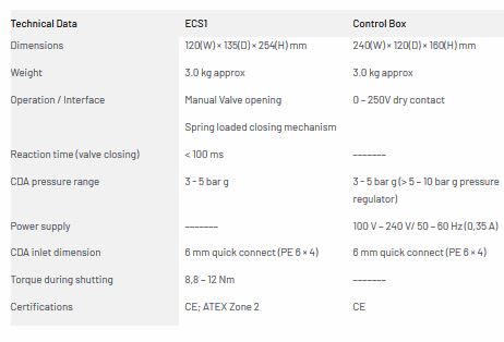 ECS1 is an automatic mechanical shut-off system. Dangerous, flammable or toxic gases are applied in numerous industrial processes. ECS1 is a highly efficient method of switching off dangerous gases directly at the source in emergency situations. It is designed to prevent gas explosion and gas poisoning caused by leakage of highly pressurized gases.
