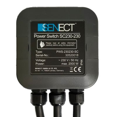 Maximising output power – switching 230 V AC consumers with the Power Switch SC 24-230. The SENECT Power Switch 24-230 can be used to switch 230 V consumers on and off via the 24 V actuator output ports of SENECT control units. This enables for example the use of 230 V oxygen generators with the SENECT|ONE or to maximise the functionality of the AQUACULTURE|CONTROL to switch up to eight 230 V consumers.
