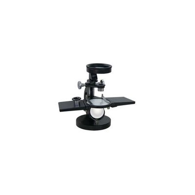 Heavy round base with a precisely designed body, providing convenience for easy lifting and movement. Sensitive focussing is done by rack-pinion moving on a lapped dovetailed guideway with a stopper to limit the downward movement. A joint Revolving Arm is provided for moving magnifying lens over full area of the stage; it is easily replaceble by a special BULL EYE LENS 83mm. dia. to increase the field of vision. A plano-concave mirror fitted in fork for light reflection, sturdy removable handrests and arrangement for inserting white or black plate for respective background, help easy working on the instrument.