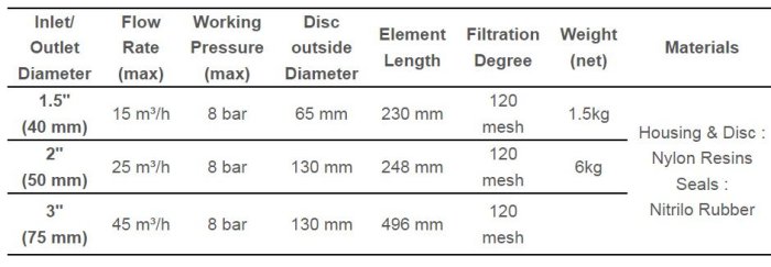 Small and medium flow of Irrigation systems in greenhouses, small/medium farm fields. Strongly built Nylon resins body enables resistance for high pressure. Long lasting and strong designed in Closure system. Wide range of flow rates. High quality raw materials of disc elements resulted in fine filtration. Perfect pressure sealing at low and high pressures. Easy to install/remove/maintain and simple expansion of existing system. Long-term operation with little maintenance or cleaning. Maximum cost efficiency.