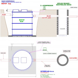 Treatment plants are manufactured as plastic, waterproof basins divided into chambers by separate mechanical and biological units within which phases of purification of wastewater are carried out. Inside the basin there are inlet screening, the aeration system comprised of air transmission, aerator and air pump. Surfaces of all metal parts are either protected or manufactured from stainless steel. The basin is manufactured from extruded polypropylene plates joint together by welding. The basin is of cylindrical shape, with reinforcement rings on the outside. The construction of the basin is made in such a way that it may withstand the pressure of the ground without additional construction or static measures. Hydraulic system is manufactured from polypropylene pipes and it is situated on the frame of the basin.