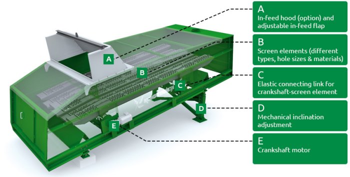 Screening plates in various designs, perforation (30/50/60/80 mm) and material texture, central lubrication crankshaft bearing, automatic grease cups connecting rod bearing, fixed or manual inclination, in-feed hood, tarpaulin cover and more.