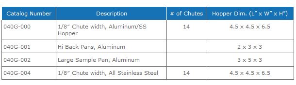 - Model 040G-000 • Microsplitter 1/8 alum., 040G-002 • Large Pan, 040G-004 • Microsplitter 1/8 stainless, 040G-004P • Pan – stainless, 040G-001 • Hy Back Pans Aluminum