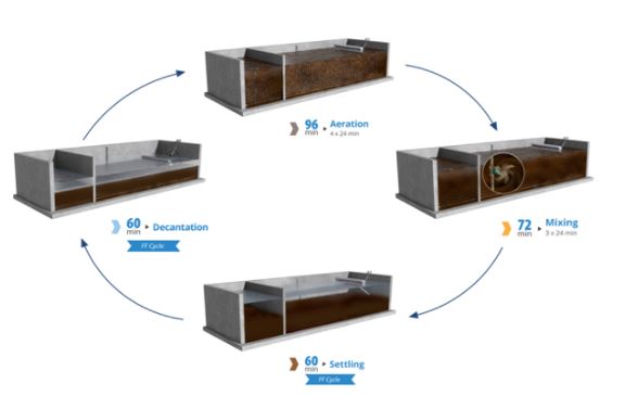 The inlet valve opens and the tank is being filled continuously, while the mixing is provided by mechanical methods (no air). This stage is also called anoxic stage. Aeration of the mixed liquor is done during the second phase by the use of fixed or floating mechanical pumps or by transferring air to the fine bubble diffusers fixed on the floor of the tank. In the third phase no aeration or mixing is provided and the disposal of suspended solids begins. During the fourth stage the outlet valve opens and the "clean" supernatant liquor exits the tank.
