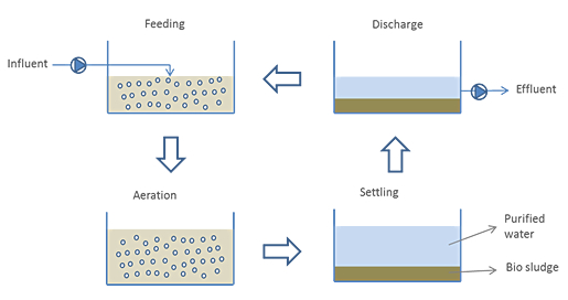 A possible configuration for a biological wastewater treatment plant is a batch reactor. In certain cases the aeration process and the settling process take place in the same basin to avoid the cost of a clarifier. In this case, the different steps of the treatment process are performed after each other. This type of wastewater treatment plant is called a sequencing (or sequential) batch reactor (SBR).