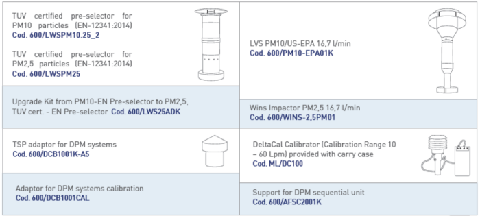 Dustcheck DPM 16 sampler can be associated, for proper use, with different types of accessories such as impactors/pre-selectors or for calibration. At the time of the instrument purchase, the correct accessories (not included in the basic instrument) must be selected for use. These are:
