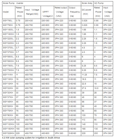 The pumping inverter controls and adjusts the system operation and converts the DC produced by solar array into AC to drive the pump , and adjust the output frequency intensity to realize the maximumpower point tracking (MPPT) . The pump, drive by 3-phase AC motor,can draw water fromthe deep wells or rivers and lakes to pour into the storage tank or reservoir , or directly connect to the irrigation system ,fountain system,ect. According to the actual systemdemand and installation conditions,different types of pump such as centrifugal pump, axial flow pump,mixed-flow pump or deep-well pump can be used.