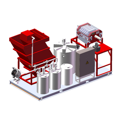 The waste water in the collection tank is transported to the Lummela clarifier through the submersible pump. Dosing system is provided to dose the right chemicals if needed. The filter box at the top of the Lamella filters out particles larger than 5mm. After entering the sedimentation tank, the supernatant overflows and is discharged into the buffer tank for reuse. The bottom sediment sludge can be pumped from the mud discharge port to the homogeneous mixing tank, and then transported by the diaphragm pump refers to the KMP filter press system for sludge dewatering treatment. The whole process is controlled by PLC program, fully automatic, and can be unattended operation.