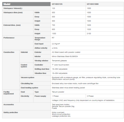 These units can be used with talcum powder, and optional reach-in glove ports allow rotating the test sample without opening the door.