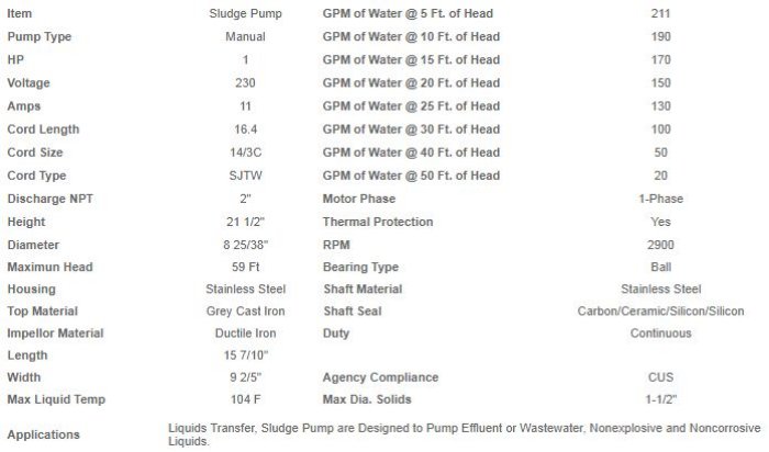 1 HP/ 220-400Volts, Phase: 3, 2" Discharge, 16` Cord Length, Manual Operation, Solid Pass: 1.5".