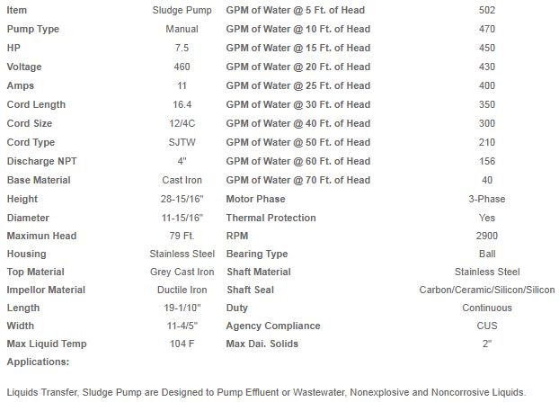 7.5 HP/ 5.6 KW, 220-400Volts, Phase: 3, 4" or 6" Discharge, 16` Cord Length, Manual Operation, Solid Pass: 2".