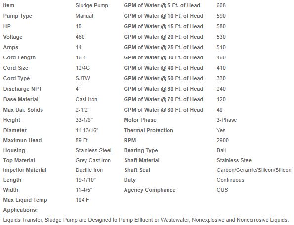 10 HP/ 7.5 KW, 220-400Volts, Phase: 3, 4" or 6" Discharge, 16` Cord Length, Manual Operation, Solid Pass: 2 5/9".