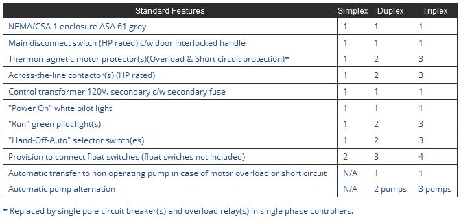 Sewage pump controllers are installed to automatically start and stop pump motor(s) in order to remove liquid accumulated in a sump pit or sewage lift station. Automatic level control is provided by start and stop float switches. Automatic alternation is provided on duplex and triplex sewage pump controllers. The completely assembled and wired controllers are factory tested before shipping. All components used in Tornatech sewage pump controllers are CSA listed and UL approved. Tornatech favors fuseless motor protection for easy field maintenance.