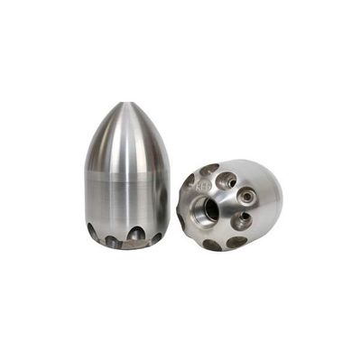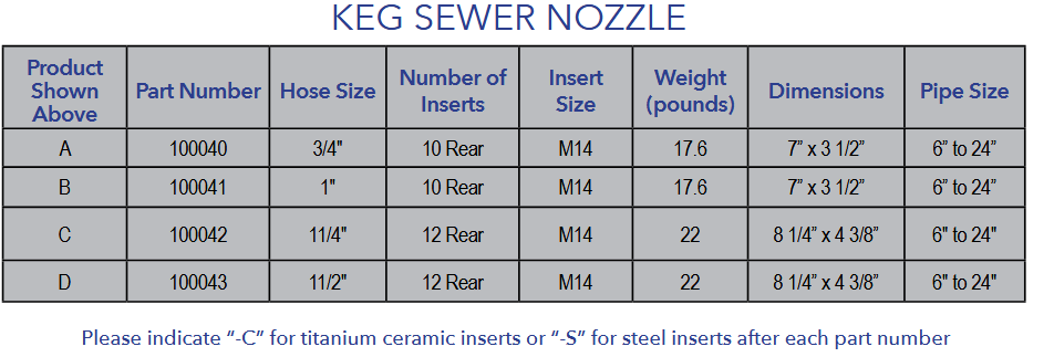 Available for hoses from .75” through 1.5”, KEG’s Sewer Nozzle is truly a “Heavy Weight” in the sewer and storm water cleaning industry. The Sewer Nozzle ranges in weight from 17 to 22 pounds and is sure to stay centered in the bottom of the pipe for effective cleaning action. The 15° and 20° jet angles give the operator high wall force with a wide water pattern necessary to clean large diameter pipes of buildup and debris. The 10 or 12 insert set-up can be configured in steel or titanium ceramic. The Sewer Nozzle is a Tier Three Nozzle, and is over 80% efficient!