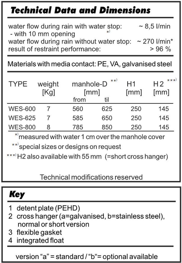 Application: The sewer infiltration water stop WES-600/625/800 is used for the restraint of surface water from manholes of the sizes DN 600,625 resp. DN 800. It is used in all cases where sewer infiltration of surface water during rainfall should be reduced or prevented. During rainfall an integrated float reduces the water flow into the manhole. The ventilation of the sewer system keeps working after installation of the WES. After storm water only a minimal water flow of 8,5 l/min is necessary to empty the WES again.