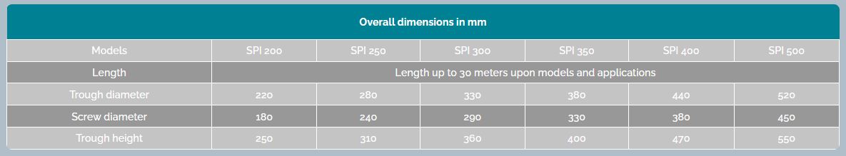 The shaftless screw is manufactured in special hard steel and lay on a PEHD protection. Rotation speed is set according to each application. The screw is maintained in its axis thanks to the trough shape.