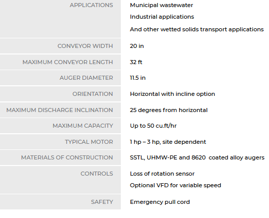 The Duperon Shaftless Screw Conveyor is ideal for debris in wastewater and industrial applications. It is constructed of corrosion-resistant, stainless steel materials and meets CEMA 300 standards with safety features to protect personnel. The Duperon Shaftless Screw Conveyor is compact, simple, and effectively transports materials from the screen or washer compactor to a desired discharge point. It is cost effective due to its low energy consumption and minimal maintenance.
