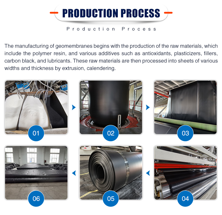 HDPE geomembrane is produced from high density polyethylene resin by film-blowing process, adding carbon black, antioxidant, anti-aging and UV-resistance component. Now it is the most widely used products for solid waste containment (such as landfill liners), mining and water containment applications.