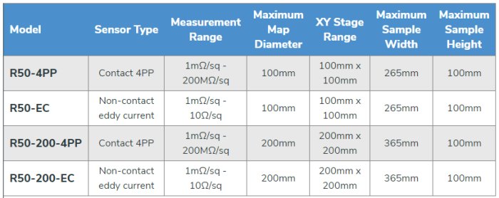 The R50 4-point probe (4PP or FPP) and eddy current probe measurement techniques support a wide range of measurements, including but not limited to the following:
