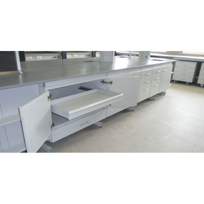 Pull-out shelf with marine edges in metal underbench cabinet with double door and 1 drawer.