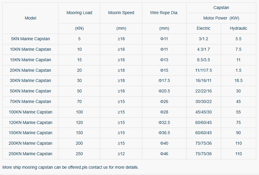 The marine anchor capstan is an important equipment of the ship. It is the mechanical device that ensure the ship can sail normally. Types of marine anchhor capstan. Due to the different application, the marine capstan is divided into anchor capstan and mooring capstan. Based on the shape, it can be divided into vertical capstan and horizontal capstan. According to the input power, it can be divided into electric capstan and hydraulic capstan.