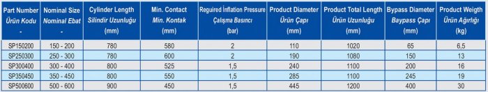 Part Number : SP150200. Nominal Size : 150-200. Cylinder Length : 780. IVlin. Contact : 580. Reguired Inflation Pressure : 2. Product Diameter : 110. Product Total Length : 1020. Bypass Diameter : 65. Product Weigth : 6,5.