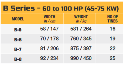 The B Model material bucket is suitable for tractors from 60 to 100 HP (45-75 KW) as well as skid-steer loaders and backhoes. This material bucket is designed to pick up rocks at ground surface. With care, it can also be used for light digging.