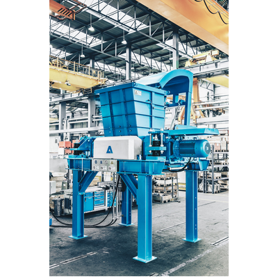 The ADuro C can be equipped with a hydraulic pusher to achieve remarkably higher throughput. The pusher movement correlates directly with the motor current. If the motor current is too high, the pusher automatically reduces its force on the material. In the event that the current reaches a critical value, the pusher moves back up and a reversing cycle begins. Different pusher types, such as special solutions for tires, ensure most efficient treatment of the processed materials.
