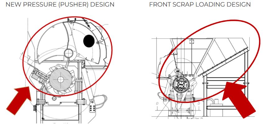 The new DESIGN WITH PRESSURE (PUSHER), avoids the annoying problem of the scrap floating on the rotor and the thickening of the scrap on the rotor itself, which therefore involves a useless waste of time and a reduced efficiency of the aluminum scrap disposal process.