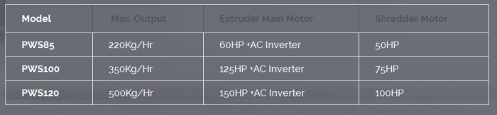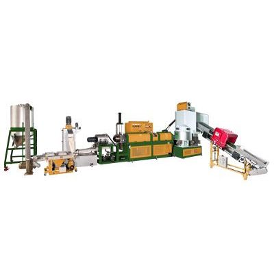 Crushing, extrusion and pelletizing three-in-one system can save space, reduce energy consumption, and lessen labor costs. Vent on the Barrel to evaporate the volatiles from the Recycle Material. Die Face water-cooling for easy operation. Conveyor material loader provides a safe working environment. The Vertical Centrifuges separate and dry the Pellets faster. Pressure gauge meter display to maintain good production and operator safety.
