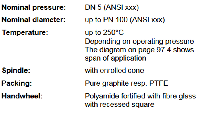 Casing and head end completely forged out of unalloyed high-grade steel C22 or stainless steel 1.4571 according to conditions of operation. Seat is mounted into casing and not exchangeable. For oxygen a design free from grease is possible (additional costs).