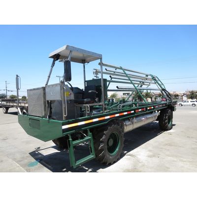 Positions for 10 pallets, 6 chains. Machine has steel construction with stainless steel squeeze channels, engine cover, driver’s station, diesel and hydraulic tanks. Folding headboard, approximately 88″ tall without a flip -over estension. Deck jacks on rear of the vehicle. A set of squeeze racks, the full length of the chains. Steel Diamond floor plate under chains. Horn locks on transfer sockets for coupling to the mating machine. Engine Cummins 3.8 QSF Tier 4 Final. OMSI axle for drive train. A second control station with all the transfer functions is located in the left rear (drivers’s side) which can be activated from the cab only when in low gear.