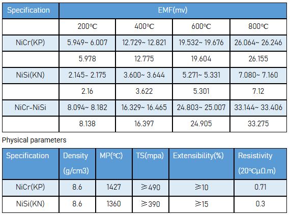 Type K thermocouple wire is the most common thermocouple conductor(>500°C), it has a good resistance against oxidation and can be recommended for oxidizing and inert atmospheres.Type K thermocouple wire can not be used in sulphurous and vacuum atmospheres directly at a high temperature.as this will have a significant impact on the EMF values. The composition of positive(KP) is Ni90Cr10. negative(KN) is Ni97Si3 for Type K thermocouple wire.
