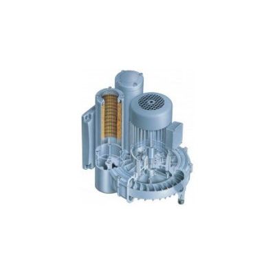 Using "multi-stage" compression, side channel blowers generate low-pulsation blast air. Perfected impeller design with curved blades guarantees optimum efficiency. Separation Of the compression chambers on both sides of the impeller permits single-stage, twin-flow as well as two-stage, single-flow operation with only one impeller. Intake filter and pressure safety valve can be integrated as an optional extra in the patented design of the sound absorbers. The sound absorbers can be varied in length, affording flexible adjustment to available installation space.