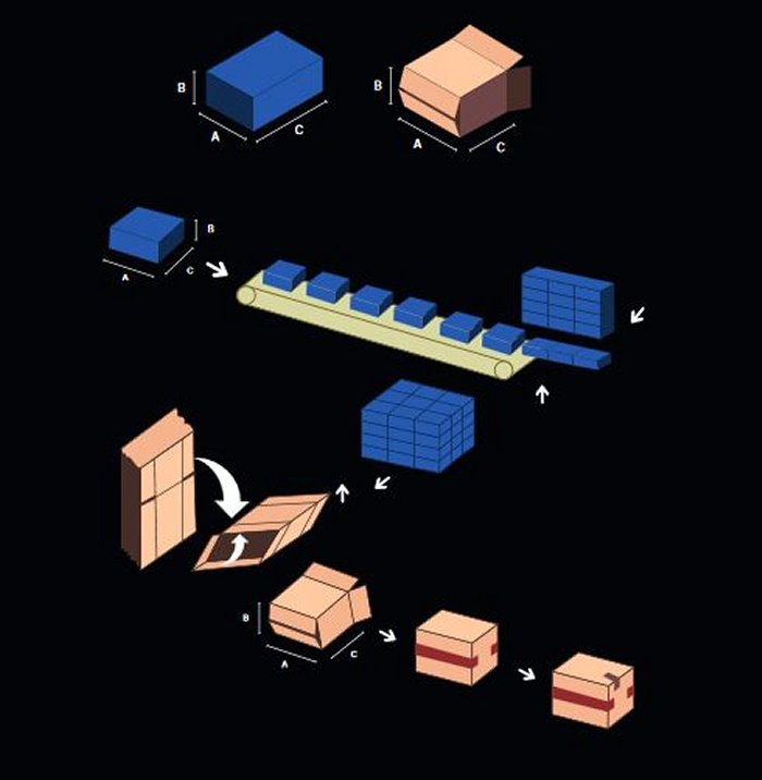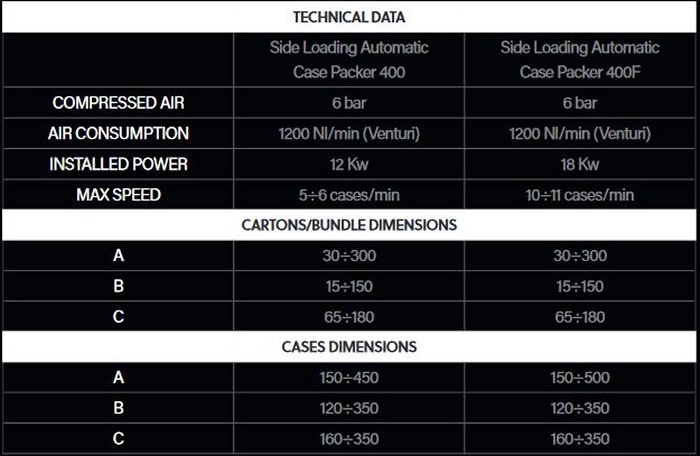 Side loading case packer, suitable for the packaging of individual or bundled cartons into American cases. The machine footprint is extremely compact and it is the ideal solution in case of space restrictions at the end of the line.