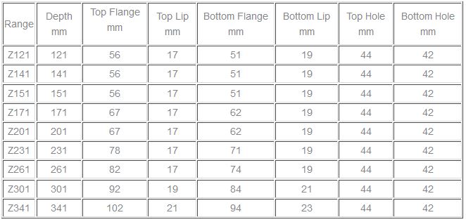 Designed in accordance with BS EN 1993-1-3. Manufactured by cold roll forming of pre-hot dipped galvanized strip to BS EN 10346 with minimum tensile strength of 450 N/mm2 and Z275 coating. Section ranges are referenced “Z” followed by three digits being the overall depth in mm. Individual sections are referenced “Z” followed by five digits the first three being the overall depth in mm and the final two being the gross material thickness in mm multiplied by 10. Sleeve references - replace `Z` with `SL`. Use the BW Building Wizard Software for accurate calculations. All holes are 14mm diameter unless stated otherwise. Other diameters are available on request.